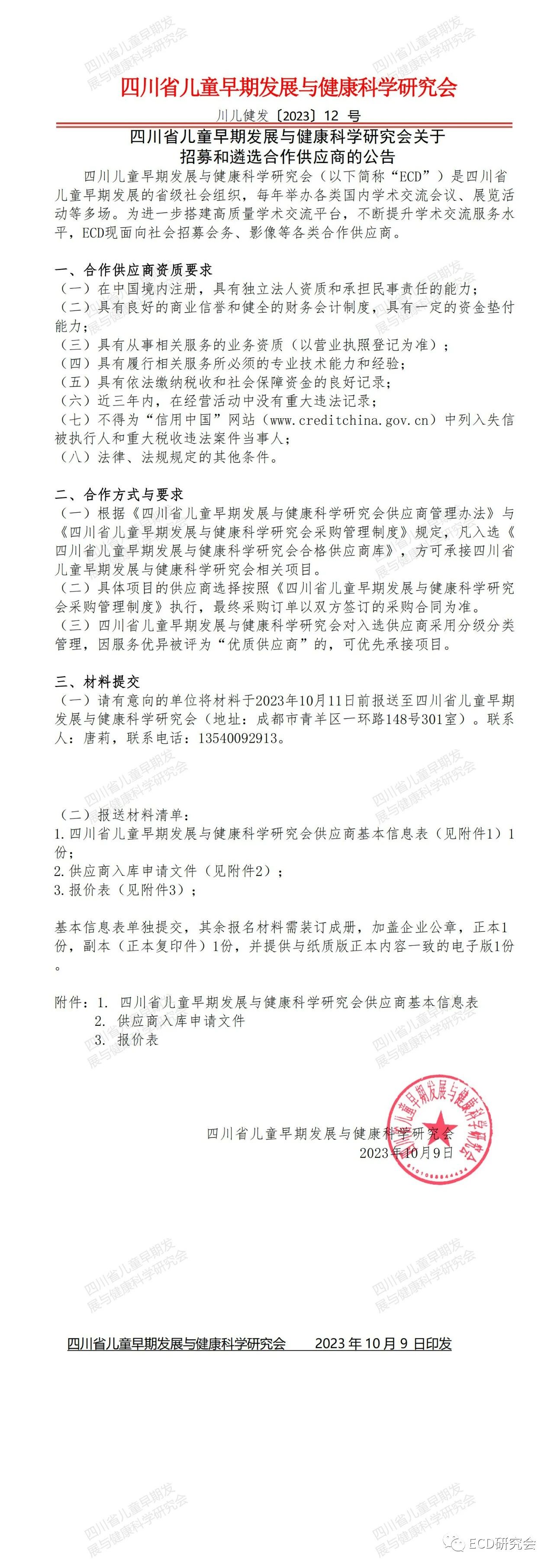 四川省儿童早期发展与健康科学研究会关于招募和遴选合作供应商的公告