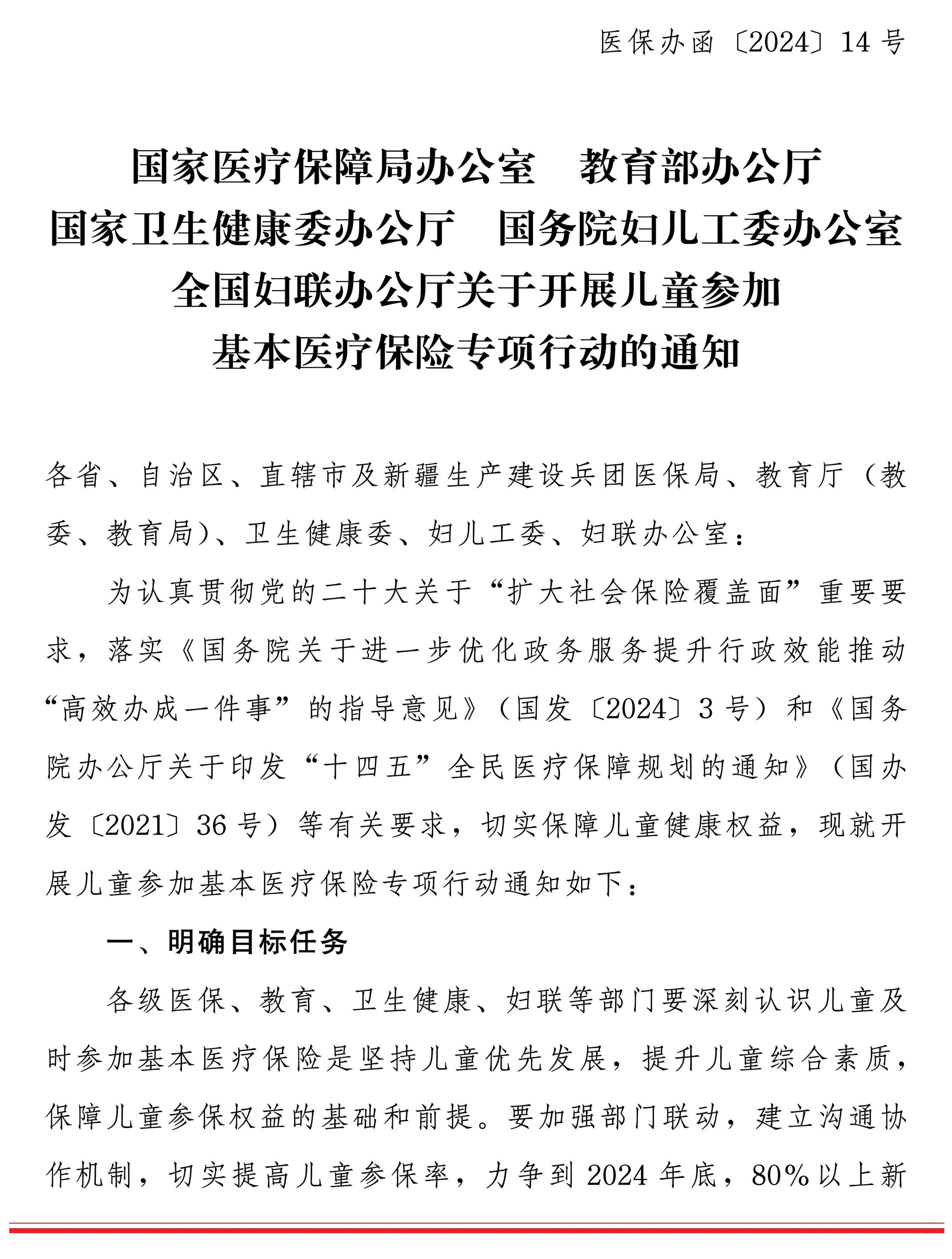 名称:国家医疗保障局办公室 教育部办公厅 国家卫生健康委办公厅 国务院妇儿工委办公室全国妇联办公厅关于开展儿童参加基本医疗保险专项行动的通知