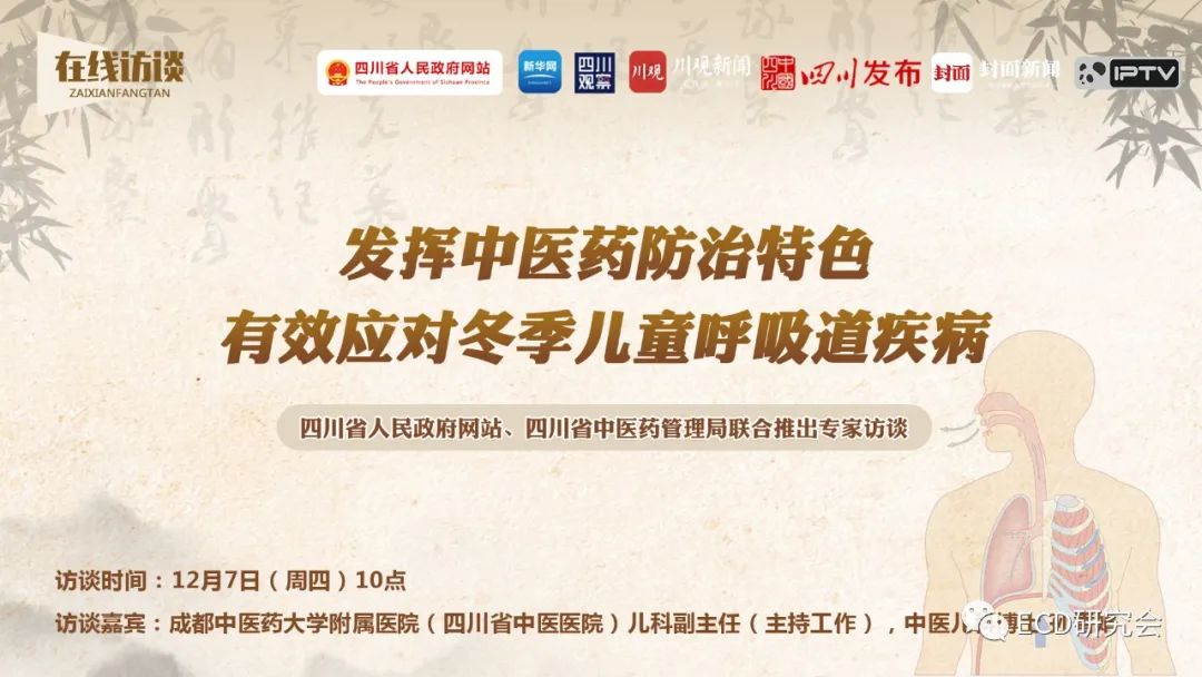 为回应冬季呼吸道疾病防治焦点问题,四川省人民政府网站、四川省中医药管理局联合推出专家访谈,12月7日(周四)10点,成都中医药大学附属医院(四川省中医医院)儿科副主任(主持工作)、中医儿科博士孙香娟将做客省政府网站与广大网友进行在线交流,敬请关注。